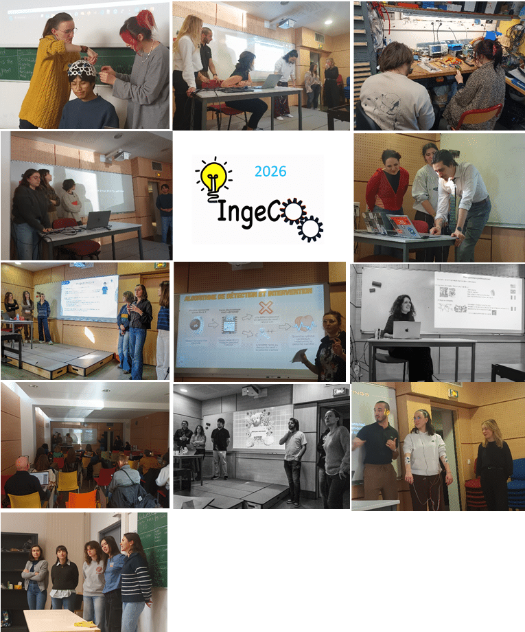 As part of the Cognitive Engineering course (UE Ingénierie Cognitive), MaSCo students—divided into five groups—designed and developed innovative projects based on the measurement of physiological or behavioral signals. These projects required skills in data analysis, experimental design, and the development of technological tools (sensors, virtual reality, etc.).