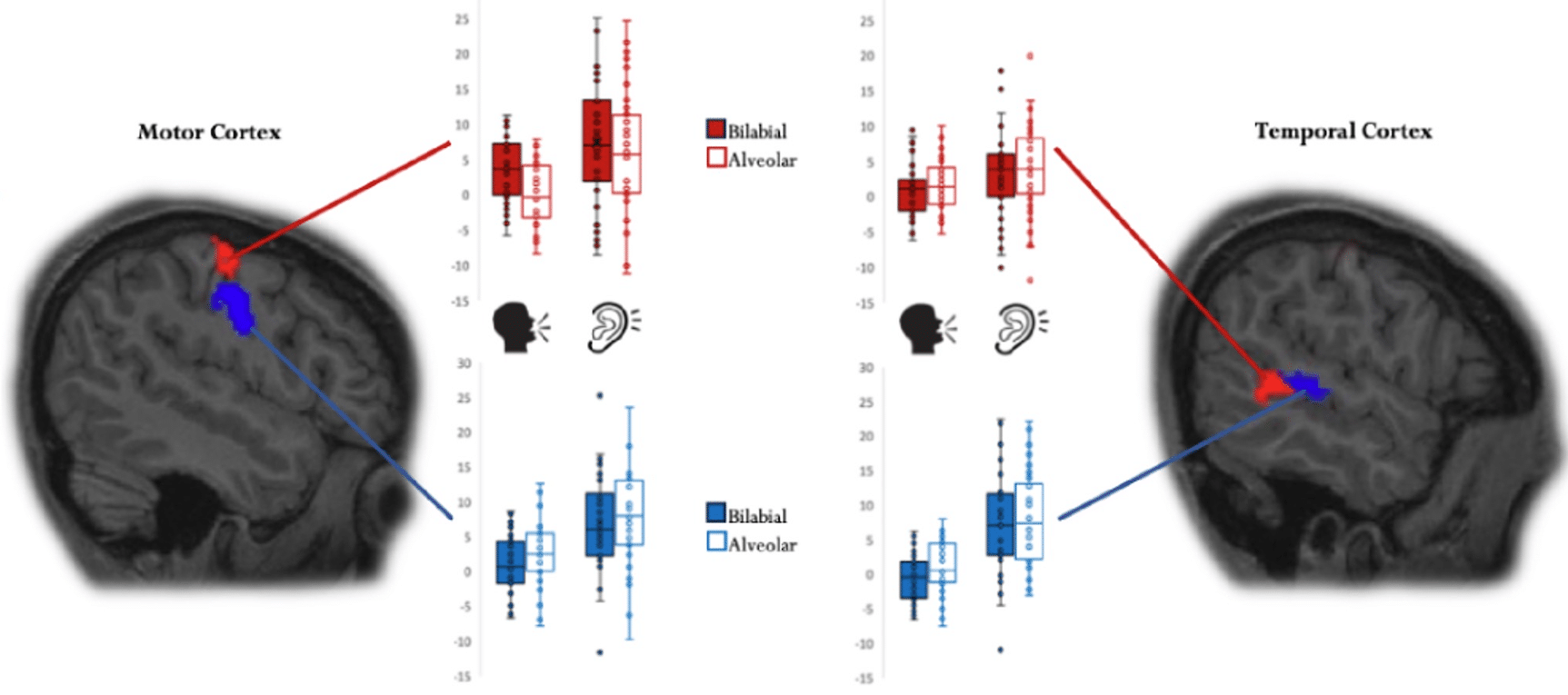 Neurobiological models of language disagree about the degree of neural overlap between the speaking and understanding. To test these hypothesis, participants (N = 37) were asked to name out-loud object names and passively listen to the same words — minimal pairs only differing in their first phoneme, alveolar as in ‘Talon’ vs. bilabial as in ‘Ballon’). For both language modalities, the motor cortex was activated topographically, i.e. with stronger tongue activity for alveolar words and stronger lip activity for bilabial words. The temporal cortex was activated in a distributed manner. These results strongly support Integration Models (e.g., Pulvermüller, 1999; 2018; Strikers & Costa, 2016), which posit shared word representations for language production and comprehension.