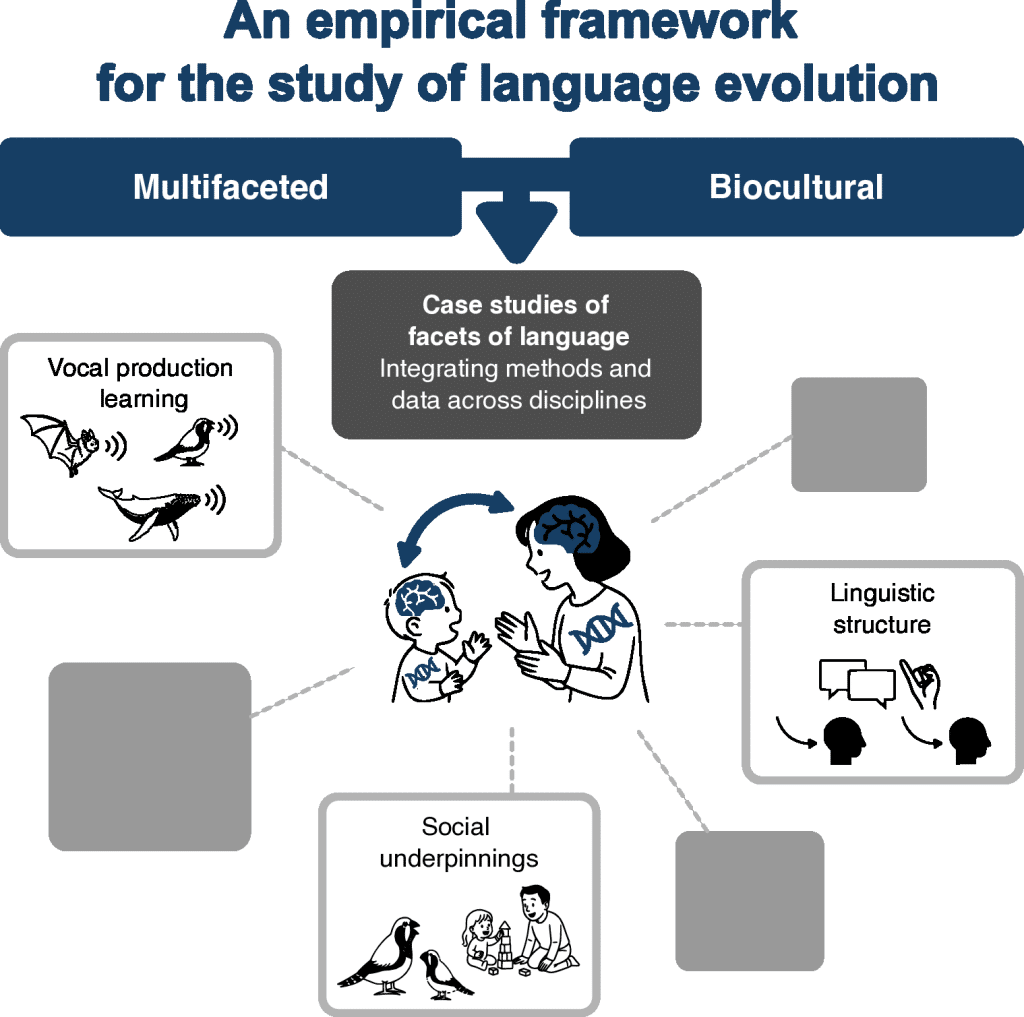 To account for human language, we propose a multifaceted and explicitly biocultural framework grounded in empirical investigations spanning a diverse array of empirical and theoretical fields. The framework is illustrated with three facets of language with distinctive evolutionary history, each involving multiple disciplines and several species — e.g., humans, primates, and songbirds. Such case studies highlight the importance of both biological preparedness and cultural processes, as well as the interactions between them, in the emergence of language. The empty gray boxes suggest other facets of language, not discussed, that could be similarly investigated under this framework.
